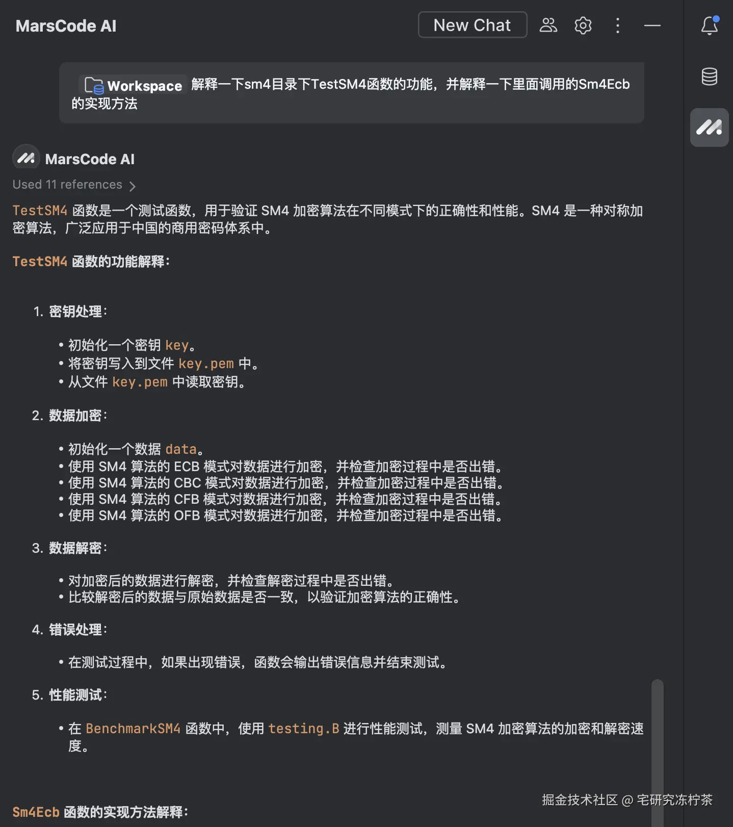 这里展示的是一个链式调用的理解,TestSM4和Sm4Ecb也是分别在两个文件中,TestSM4里调用了Sm4Ecb方法。通过引用workspace能够直接将这两个文件都引入到上下文中,豆包能自动串起来,非常方便。