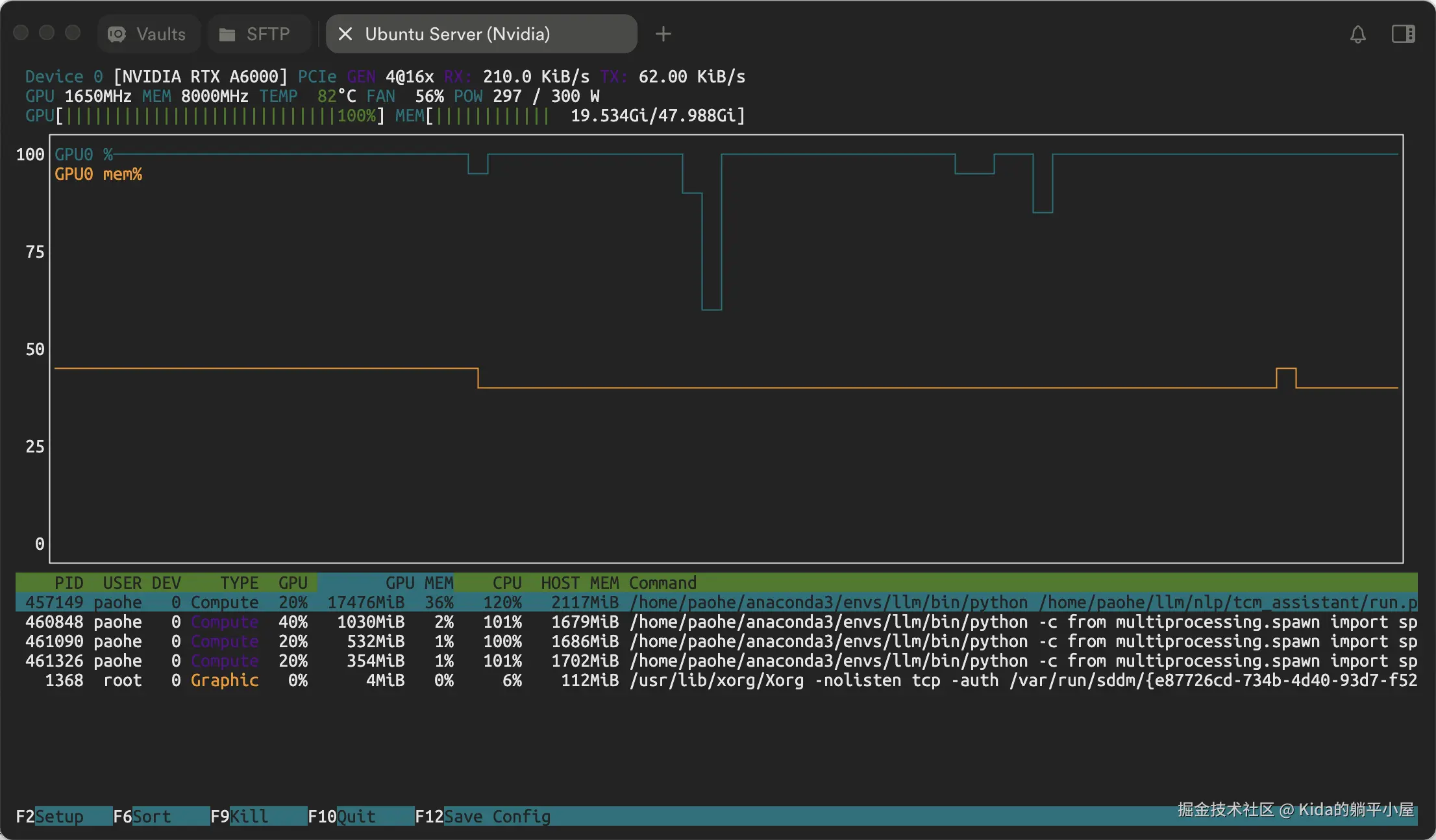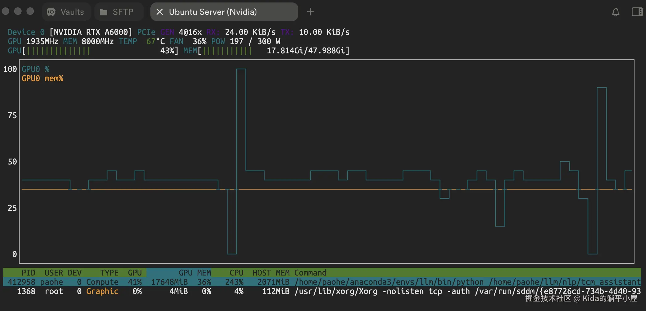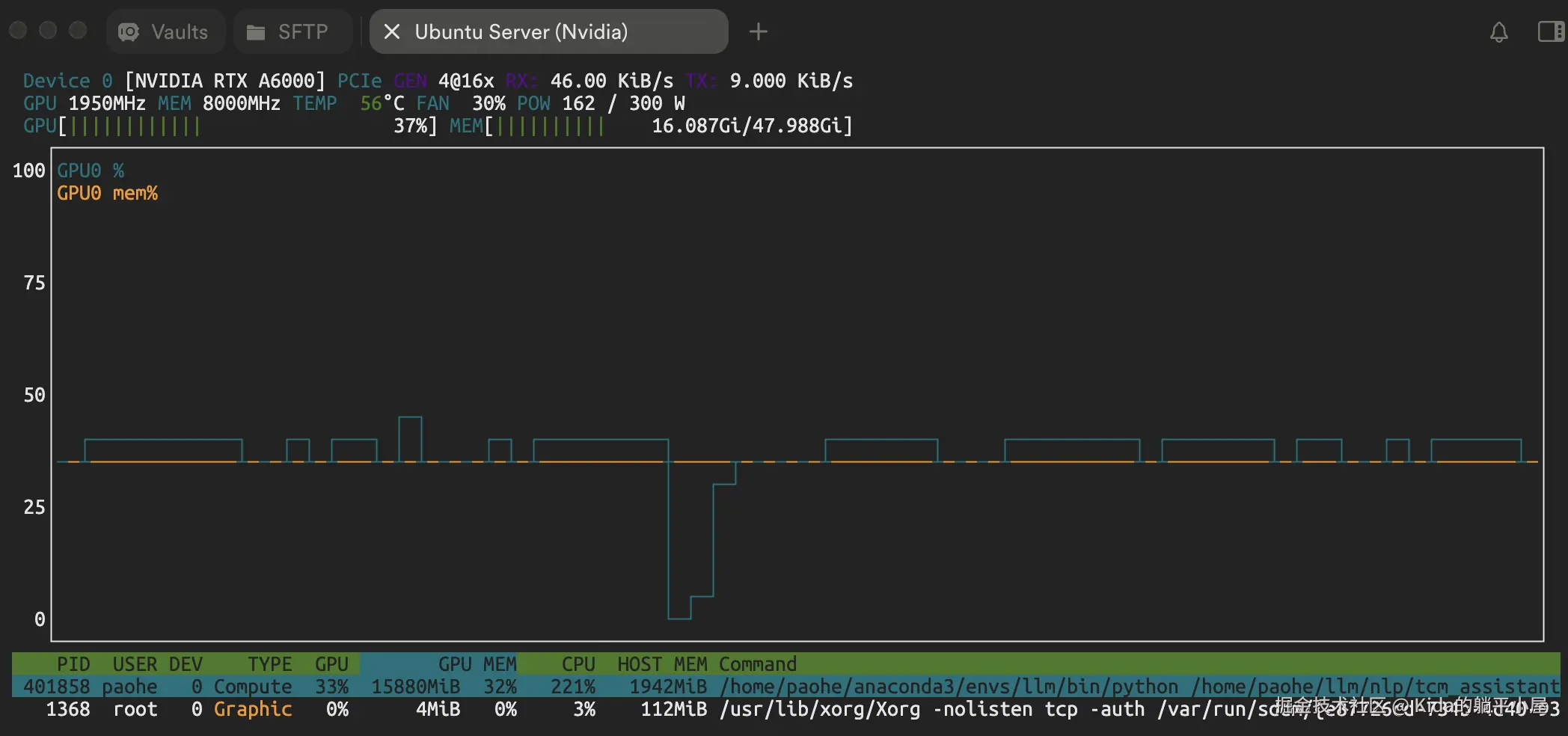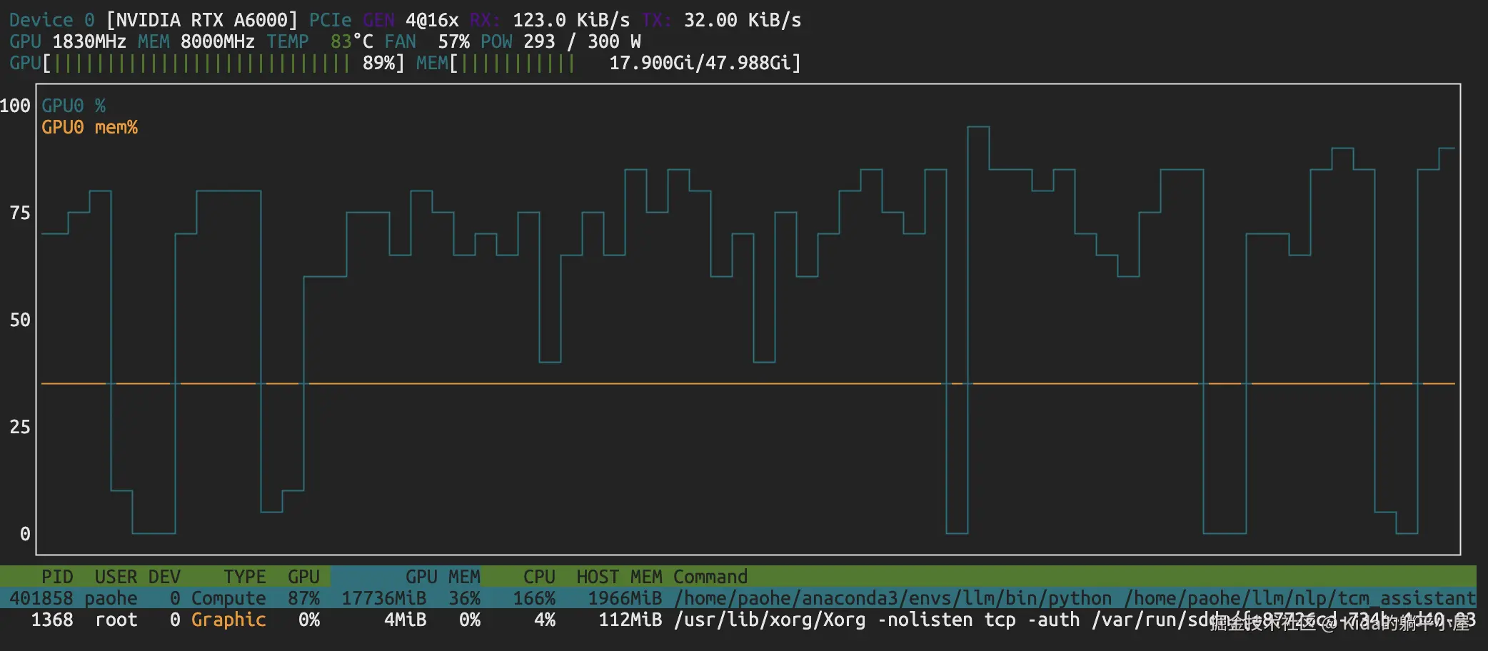 通过 nvtop 监控我们可以发现,在压测工具满负荷时 GPU 使用率稳定在 30% 左右,但到压测后期 GPU 使用率波动很大,如下图: