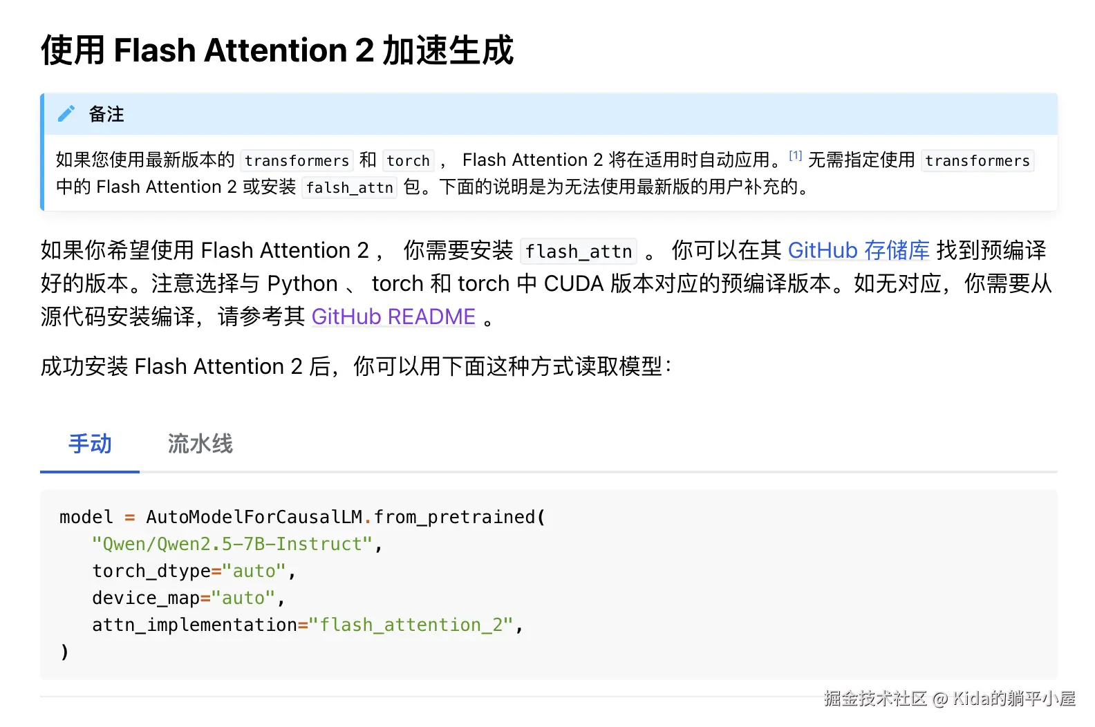 根据 Qwen 的官方文档中所述,最新的 Flash Attention 2 只需将 transformers、torch 升级到最新版本, Flash Attention 2 将在适用时自动应用而无需修改代码参数。如下图: