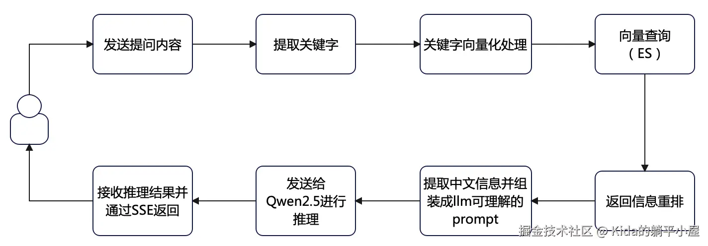 首先用户在客户端发送问题,之后会对问题进行关键字提取。紧接着关键字也需要做向量化处理,并采用 Script 方式对 ES 库中向量字段进行查询。返回结果根据评分进行重排,并选取关联度最高的 10 条数据组装成 llm 能够理解的 prompt 。之后 prompt 会发送给 Qwen2.5 进行推理,推理结果使用 SSE 协议推送给客户。