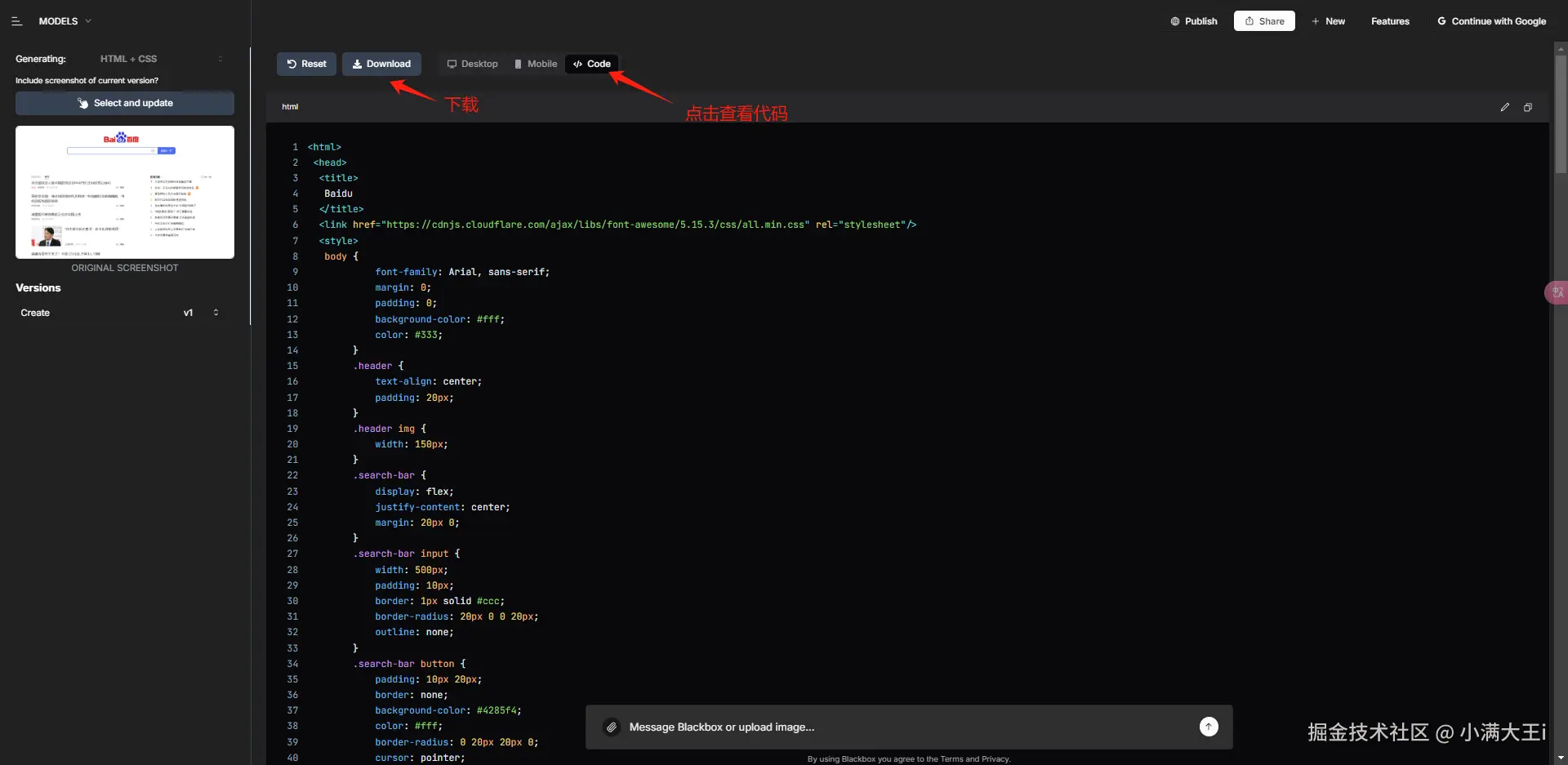 Blackbox.AI能够通过上传网页图片自动生成前端代码。用户只需将设计图像上传,系统会分析界面布局并生成相应的代码,极大地简化了开发流程,这个功能对于前端开发者来说简直非常Nice啊!