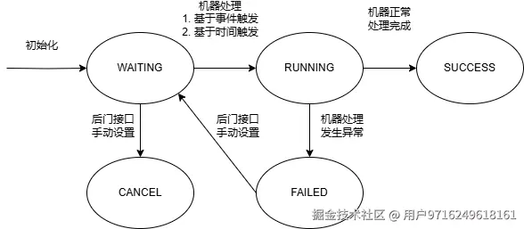 当导出任务持久化到数据库时,状态为WAITING;当导出任务被某台机器处理时,状态置为RUNNING;当机器处理完导出任务后,将该任务的状态置为SUCCESS;如果导出任务在处理过程中发生异常,则状态置为FAILED;处理FAILD状态的导出任务可以置为WAITING,重新进入队列中等待被处理;对于处于WAITING状态的导出任务,可以置为CANCEL,处于CANCEL状态的导出任务将永远不会被处理