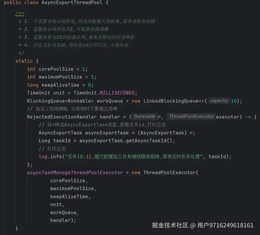a. 异步导出任务线程池:与同步导出每台机器通用信息号限制同一时刻处理的导出任务数量类似。同一时刻,一台机器处理异步导出任务的数量也要限制,我们通用线程池来实现这个功能