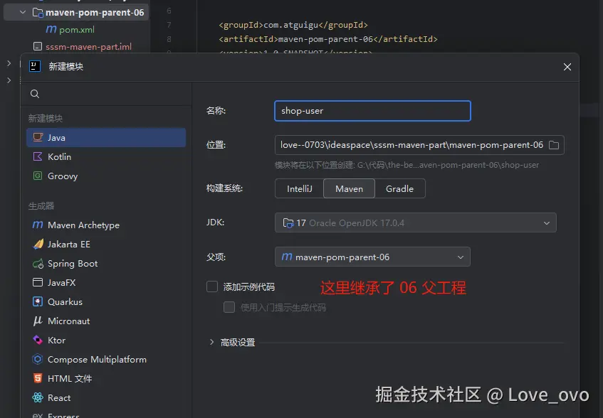 右键项目创建 New Module 选择 java语言 Maven 以及 JDK17