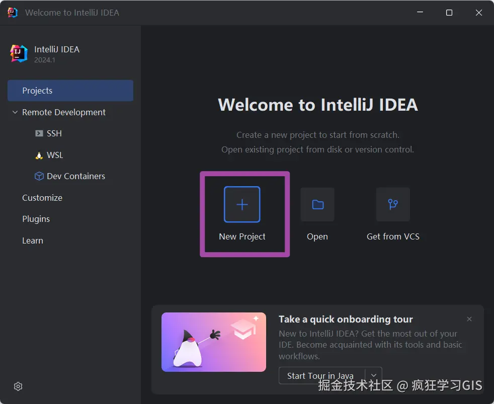首先,如果是第一次打开IntelliJ IDEA软件,就会看到如下图所示的欢迎界面。我们可以选择其中紫色框所示的“New Project”选项,新建一个项目,也可以选择其右侧的“Open”选项,打开一个现有的项目。