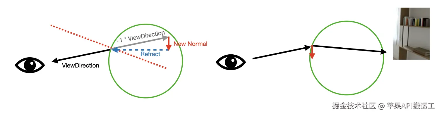 如下图,左侧是它的正常工作方式,反射 眼睛 后方的环境贴图(Skybox)。右侧是我们想要的结果,只需要计算出合适的法线就能让球体显示出 眼睛 前方的环境,再添加点扰动,就形成了类似折射的效果: