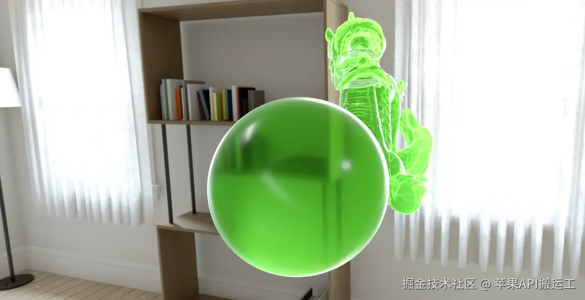 比如,我们旋转角度就会发现:透过球体看不到后面的龙,透过龙也看不到球体,它们只能显示后面的环境。