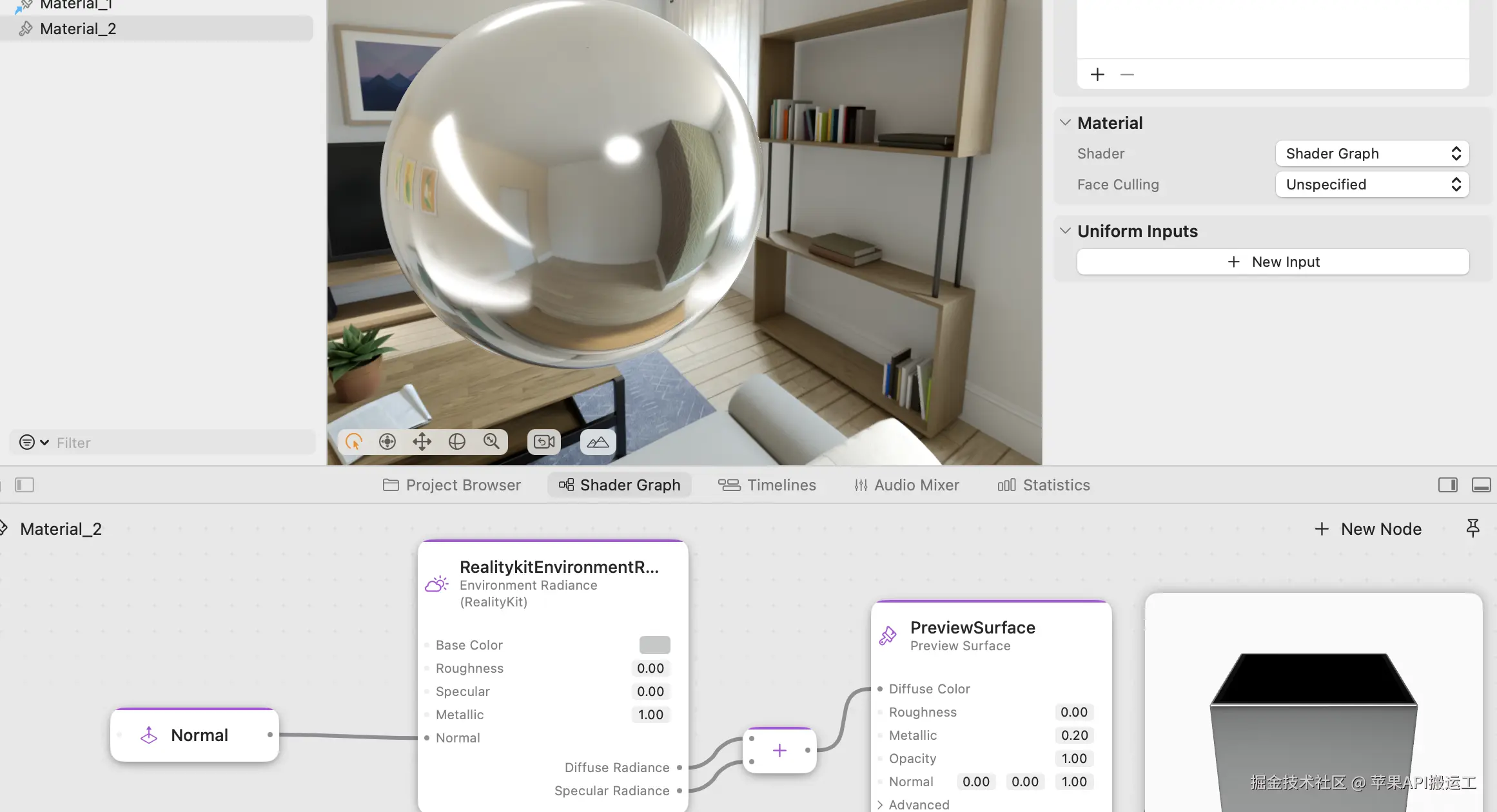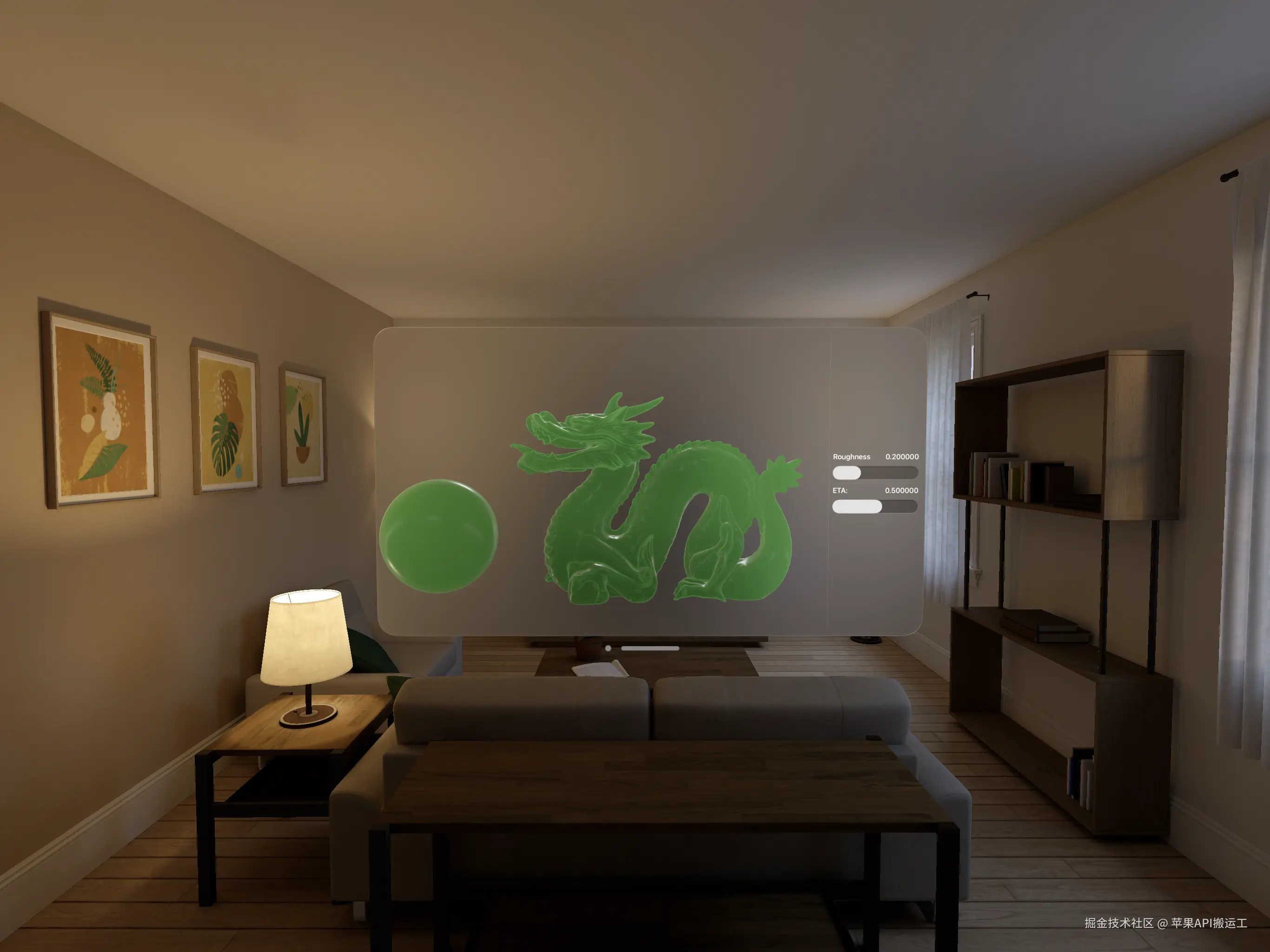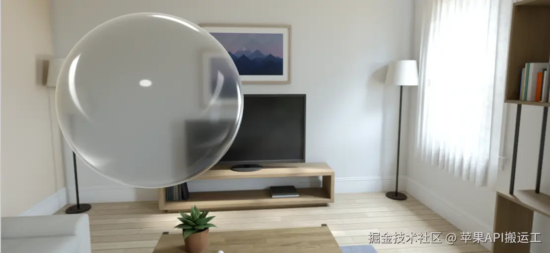 为了更好的模拟玻璃,我们需要对背景进行折射,然而 RealityKit 的渲染仍然是传统的光栅化,而不是完全的光线追踪,想要进行精准的折射是不可能的。但是我们可以用 Environment Radiance 来模拟这种效果。