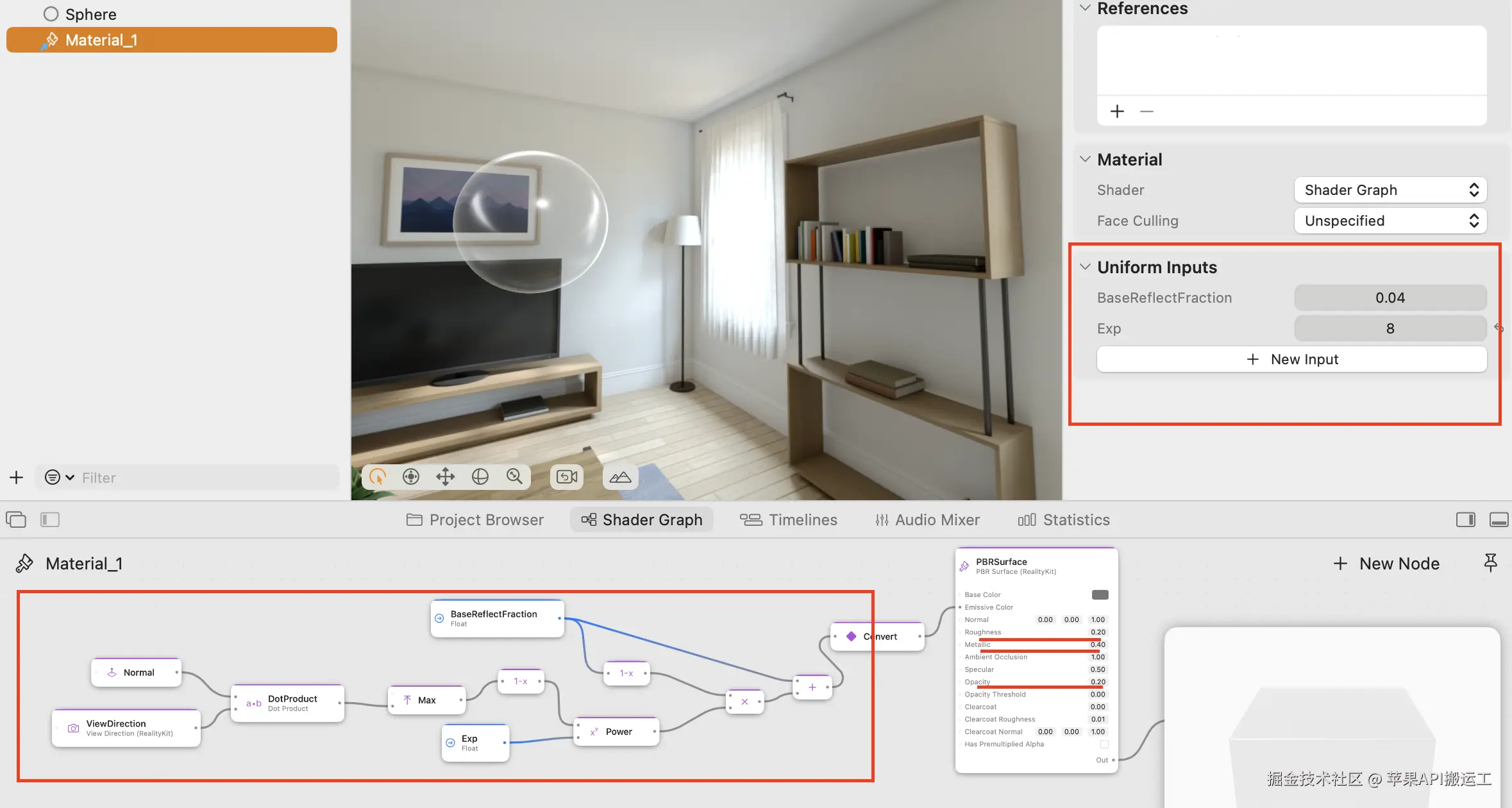 最容易想到的就是用透明物体来模拟玻璃,毕竟现实中玻璃它就是半透明的。除了调整不透明度 Opacity 外,还可以调整金属度和粗糙度,顺便再加一个额外的的菲涅尔效果(下图红框中)以增强边缘反光。