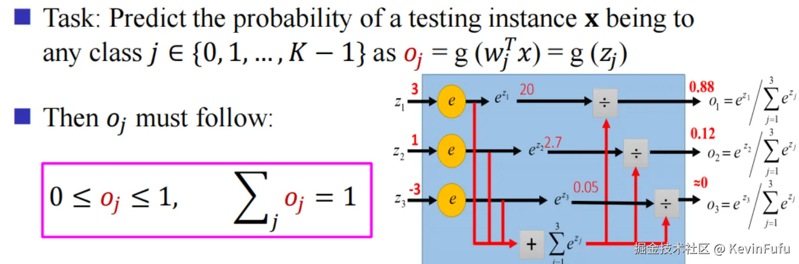 这个红色的函数就被叫做 Softmax Function(多分类函数),红色函数的分母是一个归一化的辅助值。