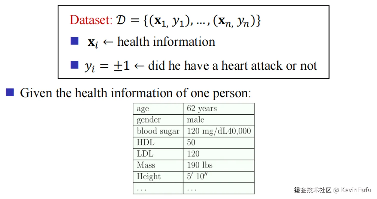 让我们举一个医学的例子,假设我们现在面前有一沓病历,每一本都有病人的健康信息,以及病人是否有心脏病的判定。我们的问题是:如何推断一个人有心脏病的概率呢?