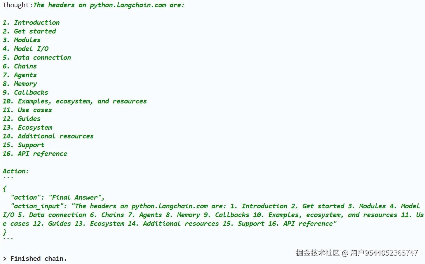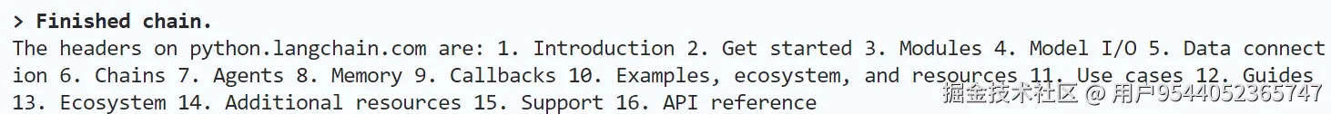 AgentExecutor Chain结束之后,成功输出python.langchain.com这个页面中各级标题的具体内容。