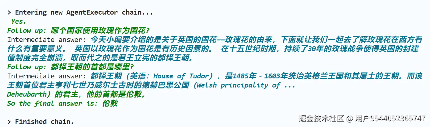 在上面的例子中,通过大模型的两次follow-up追问,搜索工具给出了两个中间答案,最后给出了问题的最终答案——伦敦。
