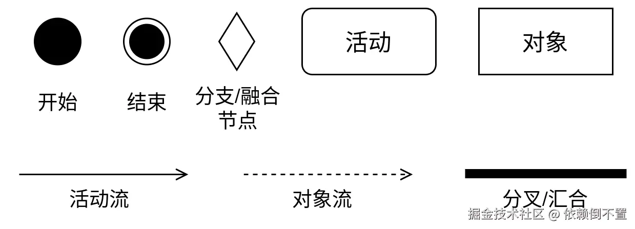 - 活动流:使用单向实线箭头表示,用于连接两个活动要素,表示两个活动的执行顺序