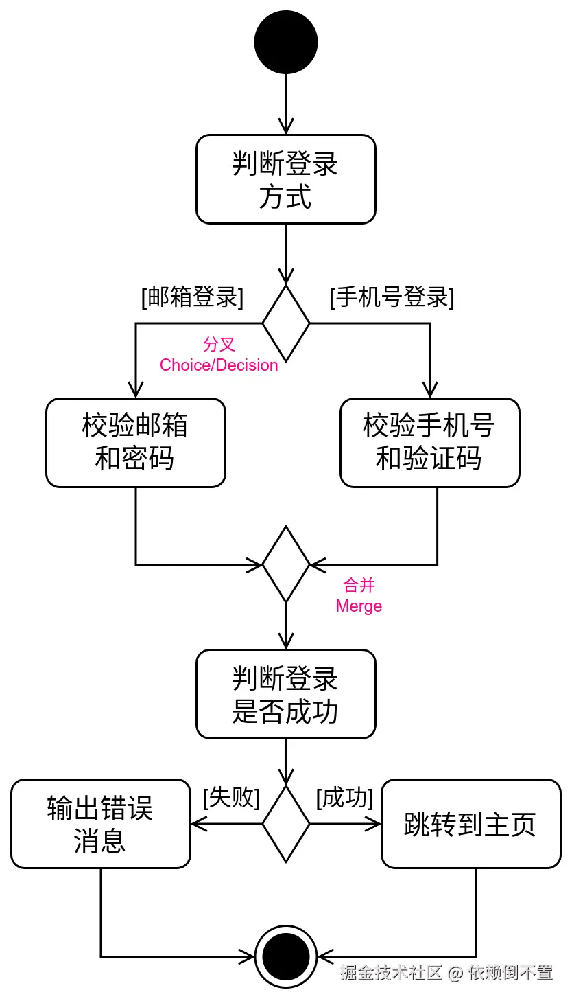 通过菱形要素表示分支,并且我们通常需要把分支条件标记在从分支要素(菱形)延伸出去的箭头线上,使用方括号[]包围条件。