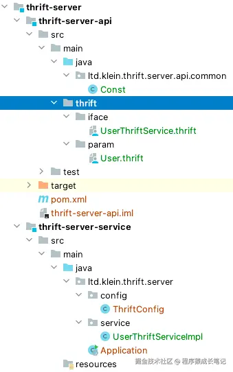 服务端的工程结构如下。拆分了api和service两个model,其中api中定义了请求参数、接口等idl,客户端通过maven将其引入。service中将服务注册为Bean,并实现了具体业务逻辑。