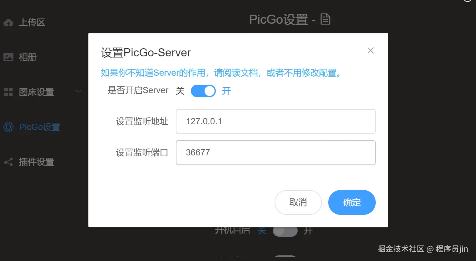 PicGo设置,找到设置Server,点击设置,点击开启Server,点击确定即可。