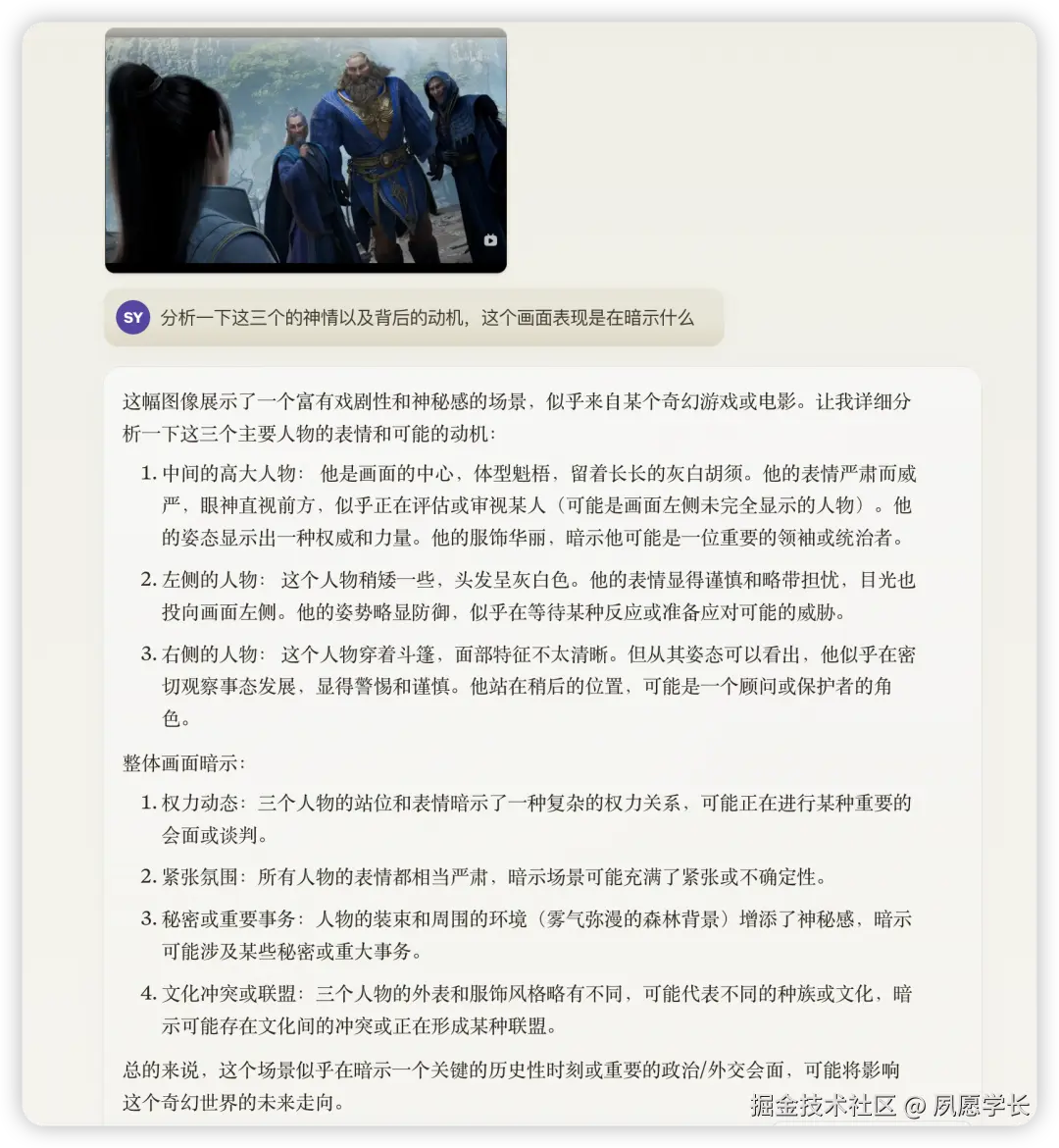 单单一张静止的动漫截图,经Claude一解读,瞬间变得立体生动起来。虽然解读不是很对,但感觉用它来扫描动漫关键画面,能很好地把握故事梗概,挺有意思的。