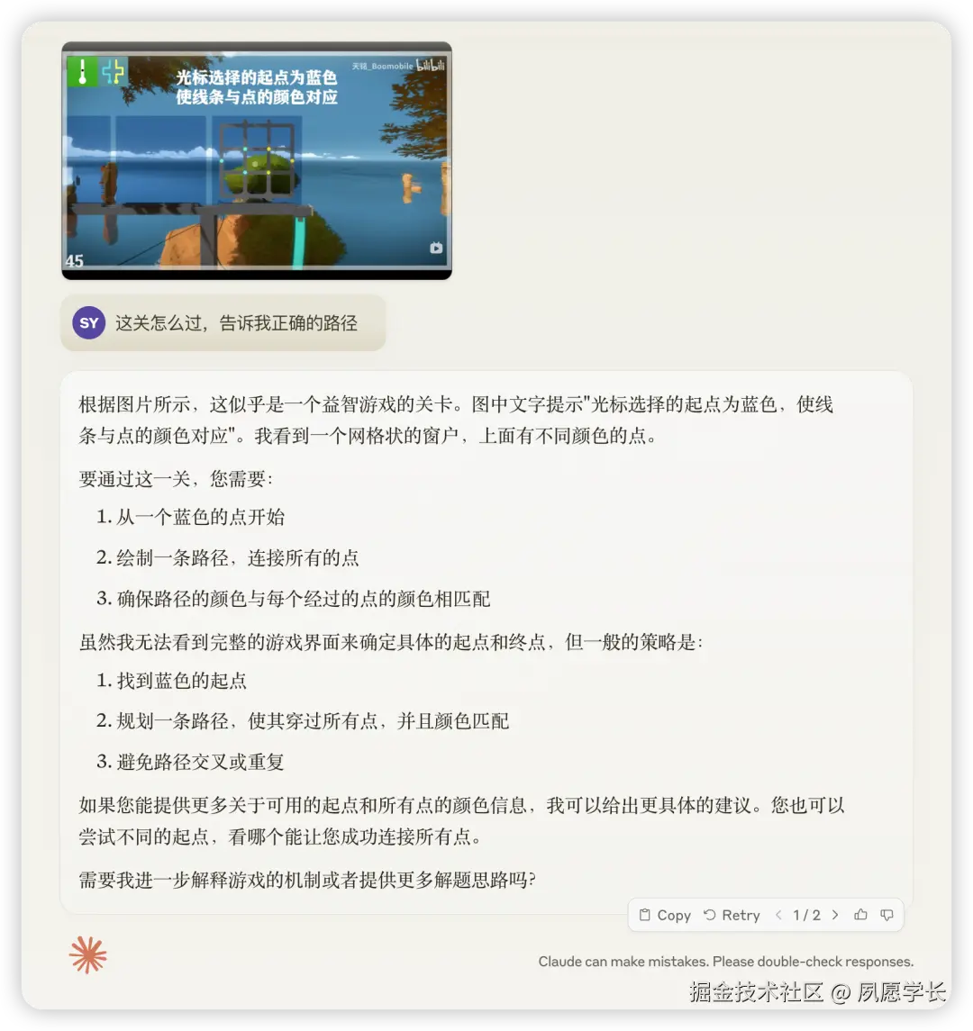 假如在玩一款新游戏时,有个关卡怎么都过不去,网上搜了个攻略截图,但图里的操作步骤还是看不太懂,此时我就把截图发给Claude,请教它如何通关。