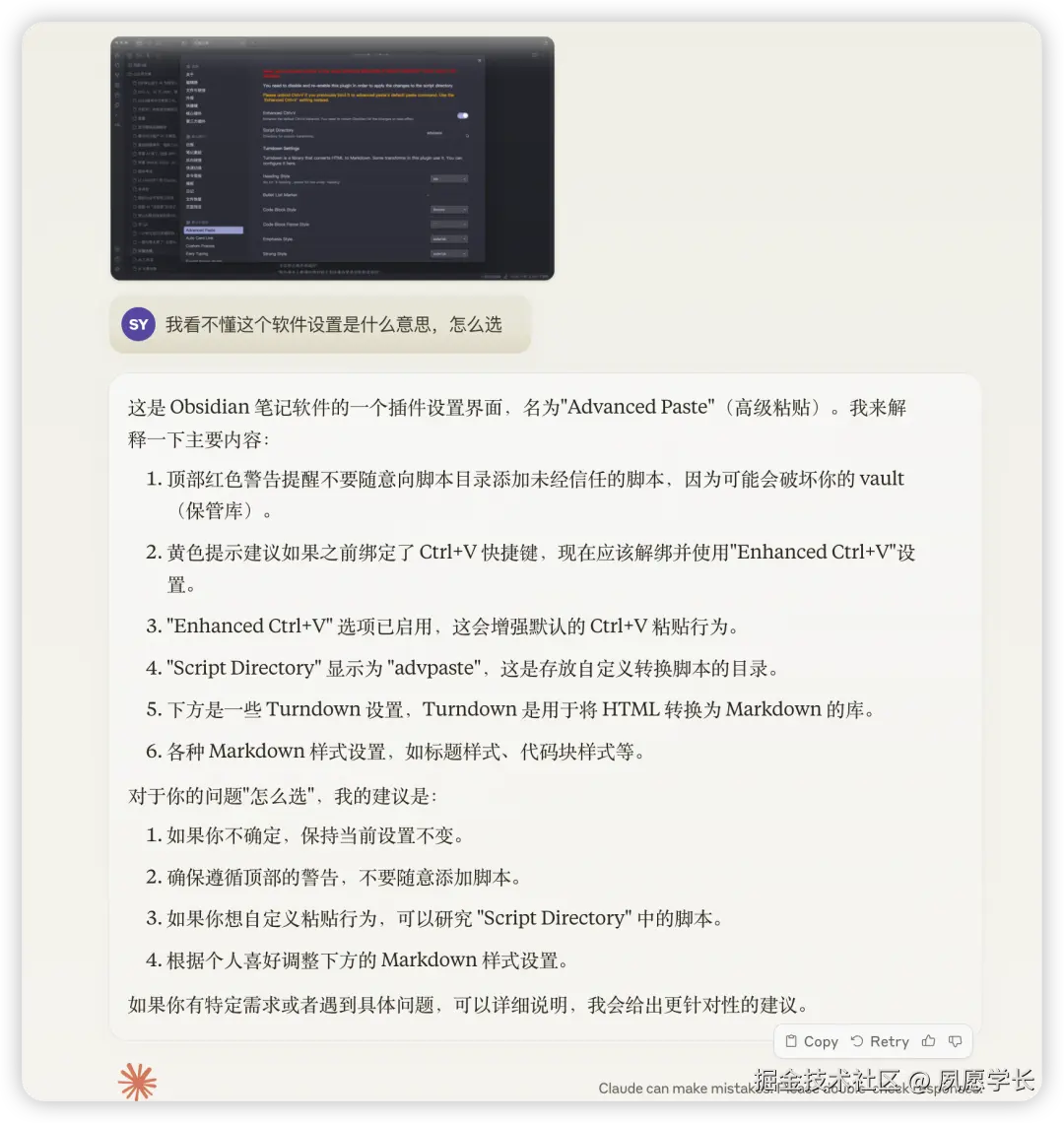于是我截了个图,让Claude帮忙解读,没想到它很快就给出了每个选项的中文翻译,还说明了各选项的功能差异,以及选择建议。