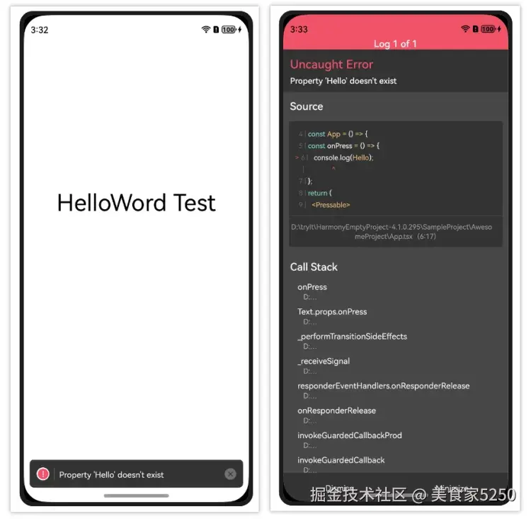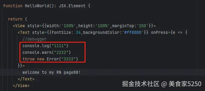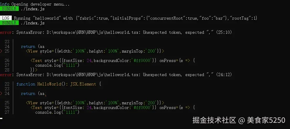 当JS代码中有报错时,会直接在跑RN服务端的命令行中出现报错日志