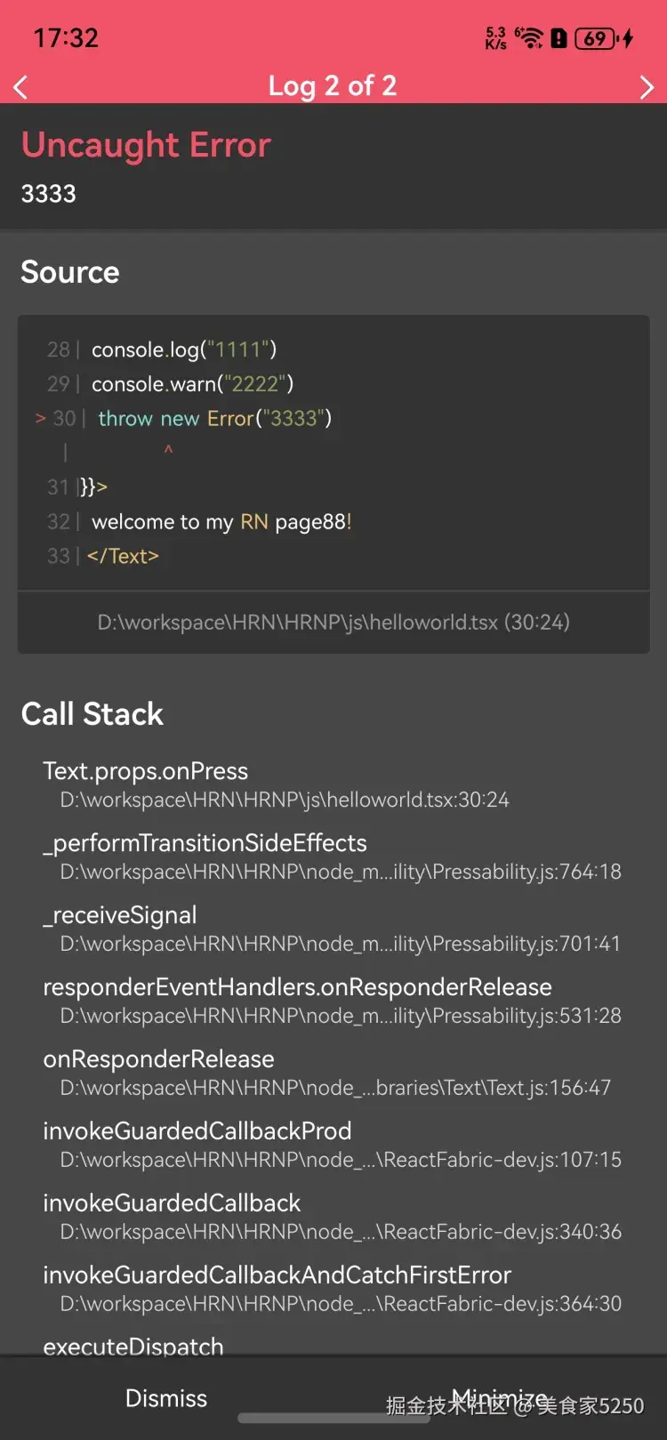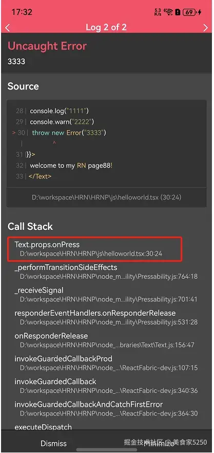 下图为logbox示意图,展示了错误的说明、源码以及调用栈信息: