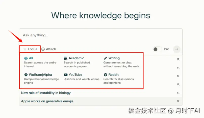 为了进一步优化用户的搜索体验,Perplexity 引入了「焦点Focus」功能,帮助用户在特定领域内获取更精准、更专业的答案。目前,「焦点Focus」支持 6 大类别的内容搜索:ALL、Academic、Writing、Wolfram Alpha、YouTube 和 Reddit。每个类别的特点如下: