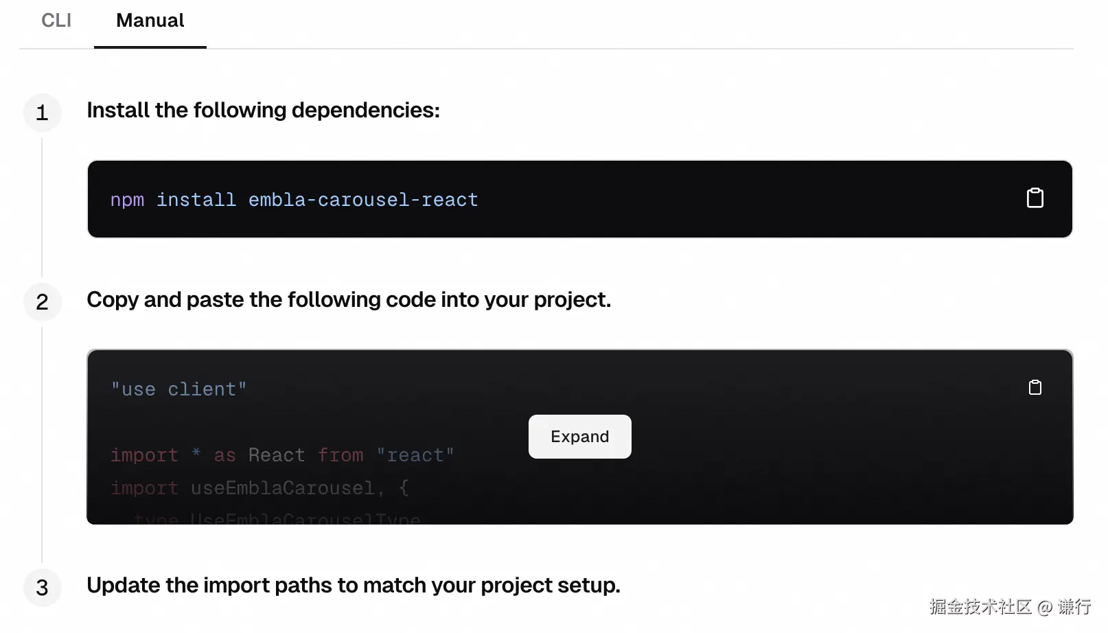 轮播(Carousel)底层依赖 Embla Carousel,通过 cli 命令仍然安逸一键生成源码,自动安装必要的依赖。手工安装时候 shadcn/ui 会给组件的源码及其必要的依赖