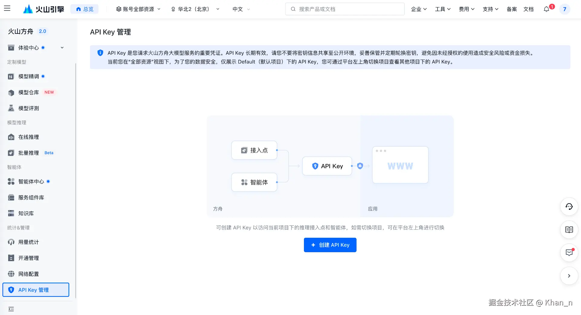 - 控制台的 API Key管理 页面中创建 API Key。