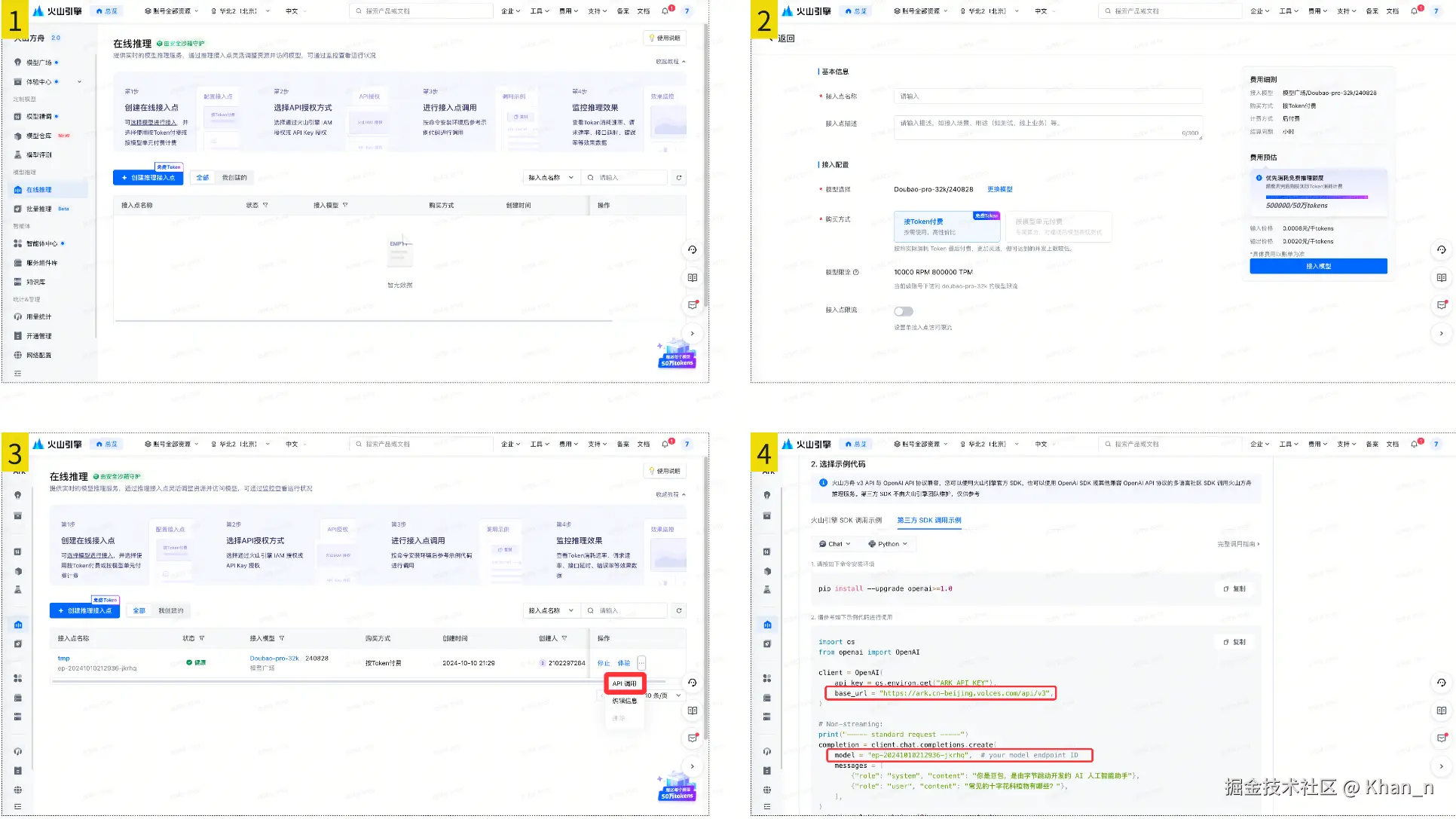 - 在控制台的 在线推理页面 中创建推理接入点,推荐使用doubao-pro-32k作为主力模型,模型部署完成后即可获得模型的base_url和model_endpoint