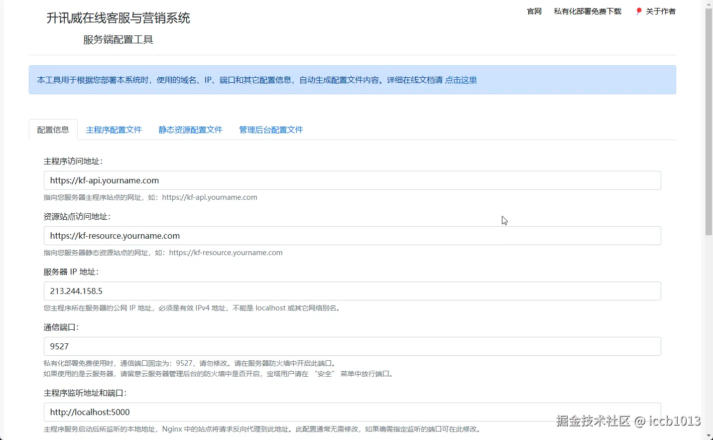 随着下载私有化部署的用户越来越多,部署配置时的便利性到了需要进一步提升的时候。 部署时需要修改一些配置文件,除了直接手工修改外,之前我提供了一个 Windows 应用程序来自动化写入配置文件,但这有一些小的弊端,很多用户选择把文件上传到服务器上之后,直接在服务器上配置,而 Windows 界面程序无法在 Linux 、宝塔这样的环境中使用。用户还是只能手工修改配置文件,经常有修改错误的情况发生。 所以我提供了一个网页版本的配置文件生成工具,直接在浏览器上使用,生成配置文件的内容,复制文件内容到终端的 vim 编辑器中直接粘贴即可。高效,实用。
