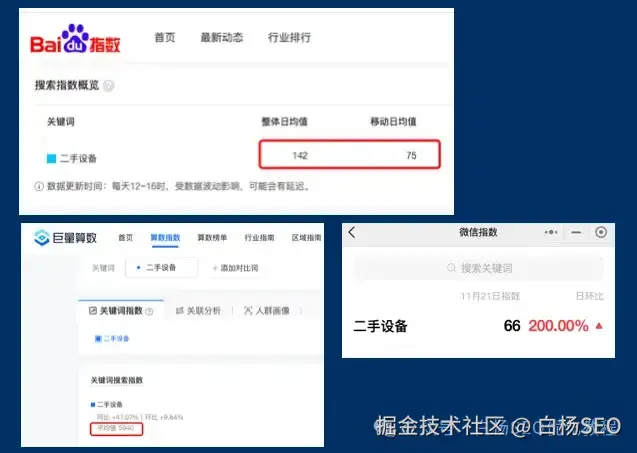 如上图数据,SEO词搜索量是微信大于抖音大于百度;染发膏是微信大于抖音大于百度,二手设备是抖音大于百度大于微信。