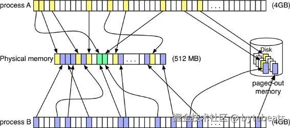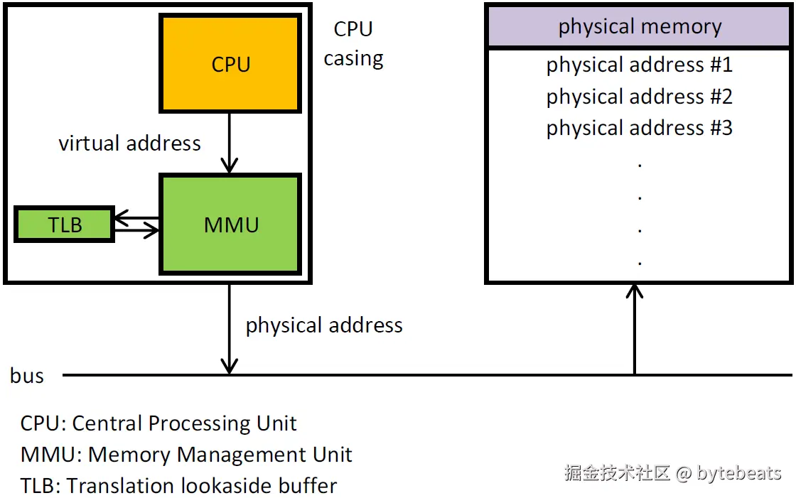 虚拟地址通过硬件(MMU, 内存管理单元)和软件(页表)的协作透明地映射到物理内存. 虚拟到物理映射信息也缓存在硬件中, 称为 TLB(转换旁路缓冲区), 供以后参考, 以便快速查找物理内存位置.