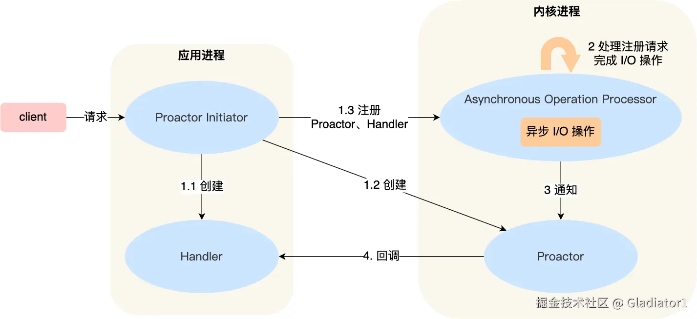 - Proactor Initiator 负责创建 Proactor 和 Handler 对象,并将 Proactor 和 Handler 都通过 Asynchronous Operation Processor 注册到内核;