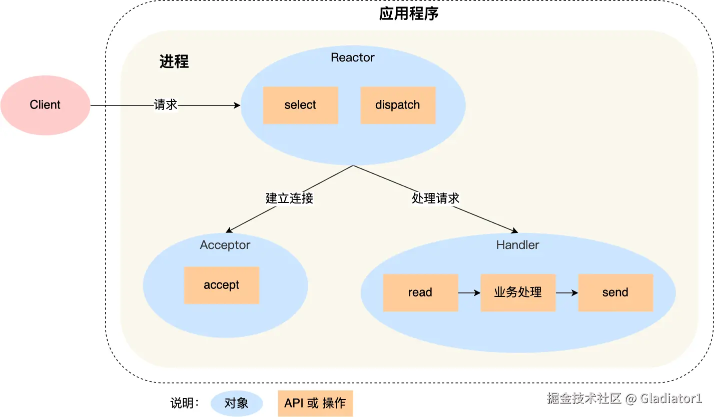 - Reactor 对象通过 select (IO 多路复用接口) 监听事件,收到事件后通过 dispatch 进行分发,具体分发给 Acceptor 对象还是 Handler 对象,还要看收到的事件类型;