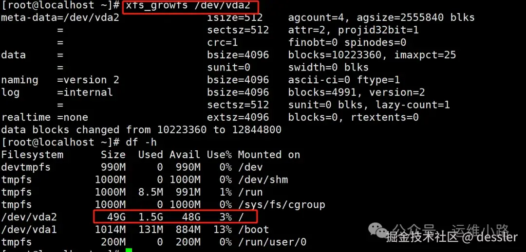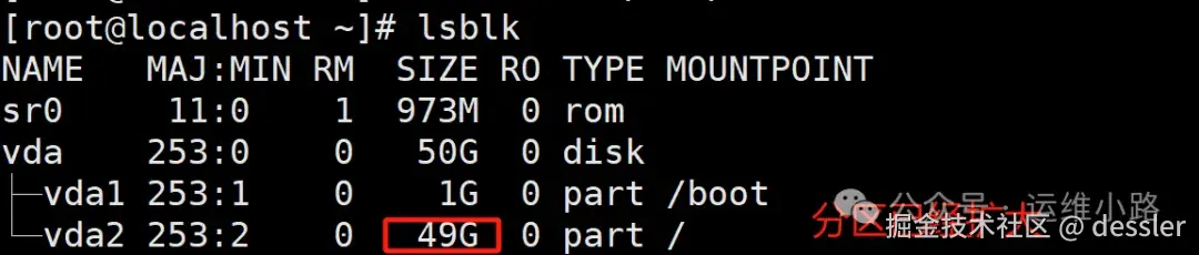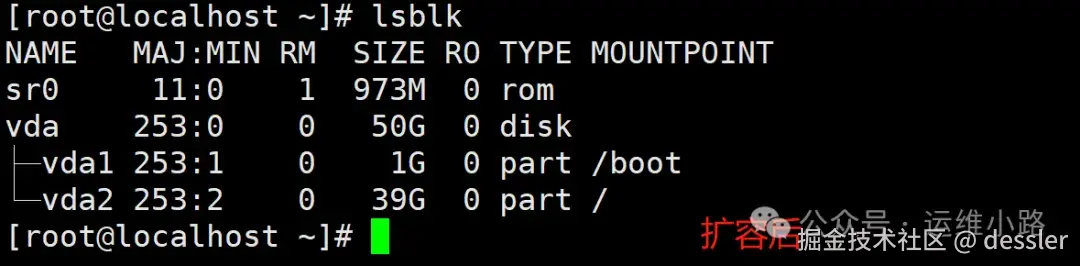 #这里我尝试了多次,都需要重启以后,vda2才会变成新的大小。才能执行扩容分区