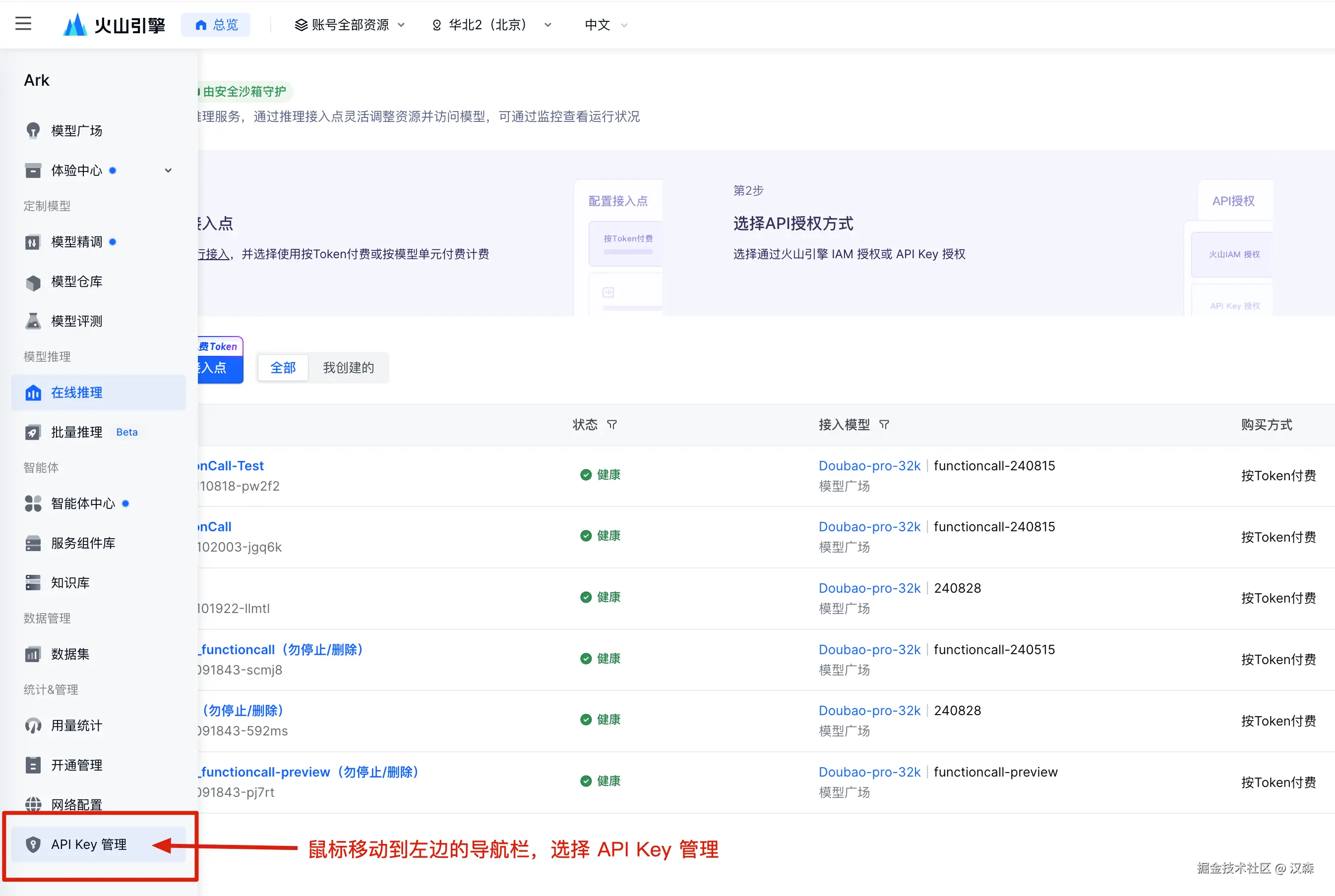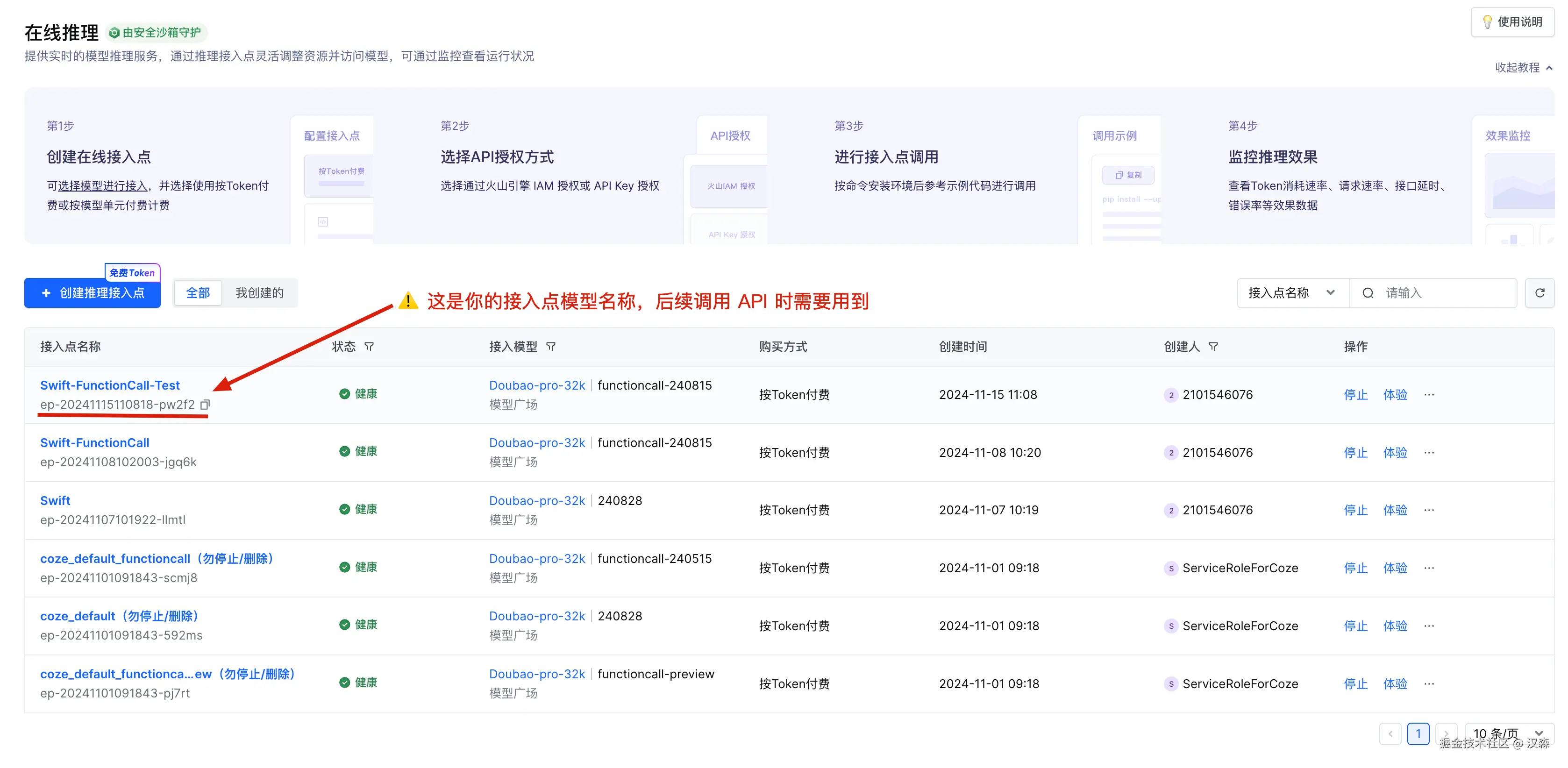 点击接入后,就会进入在线推理的界面,这里会列出你所有接入点,注意接入点名称下方会有一个 “模型名称” ,这个后续调用 API 时我们需要用到。