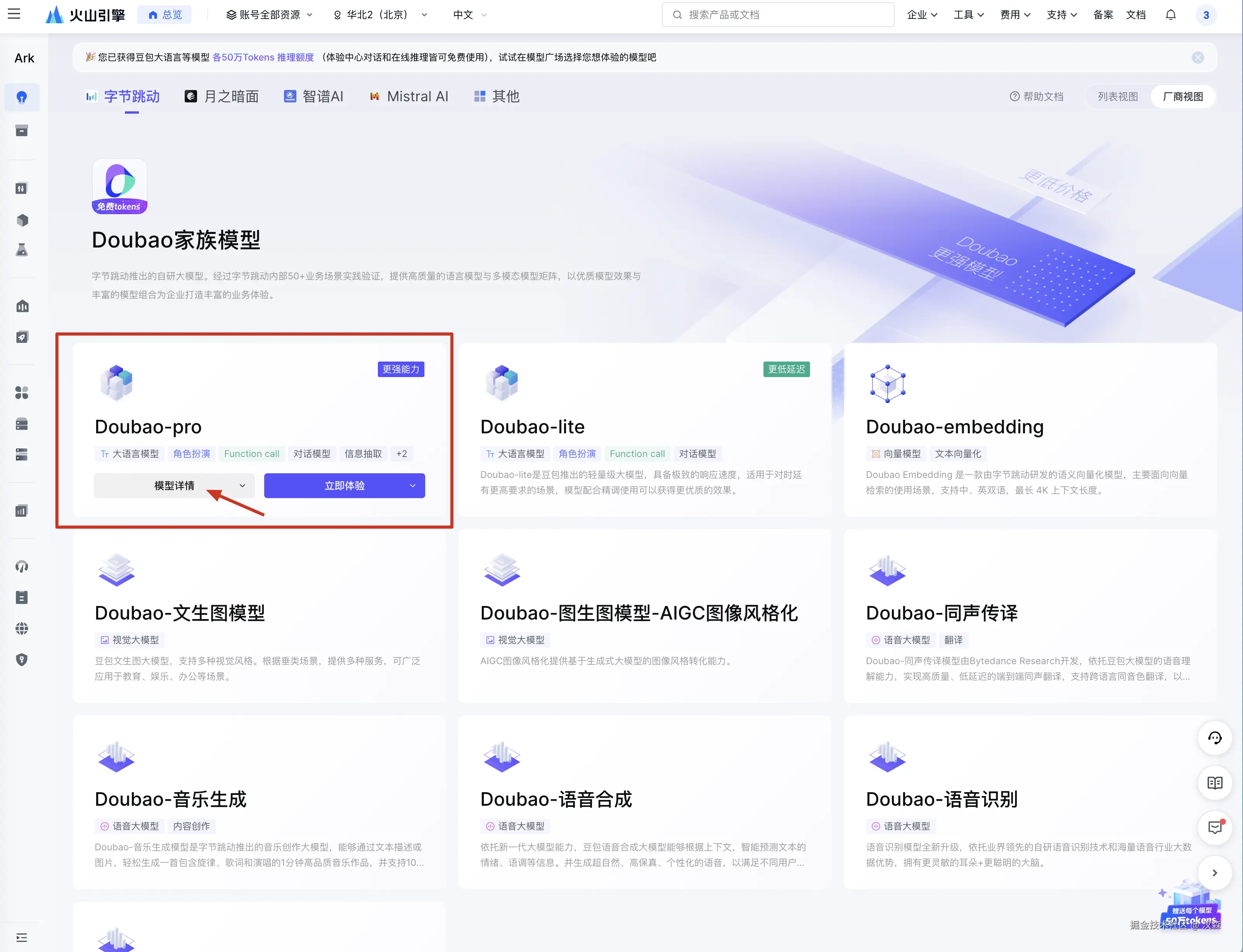 在模型广场,选择一个模型,我们选择字节的 Doubao-pro 模型: