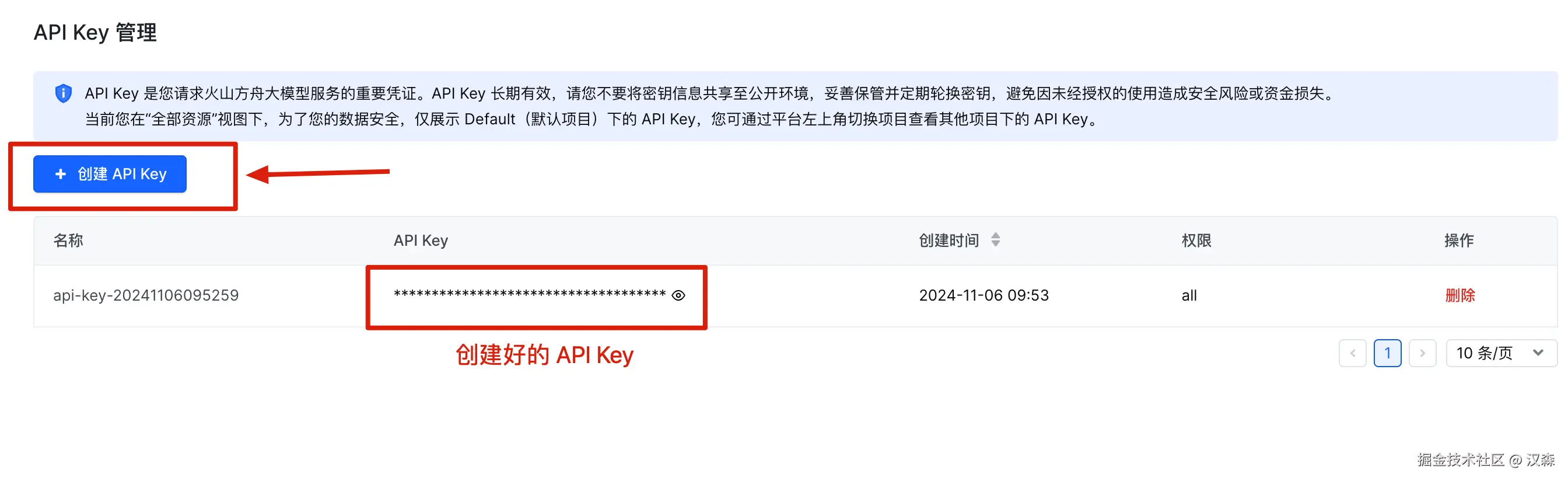 API Key 是您请求火山方舟大模型服务的重要凭证。API Key 长期有效,请您不要将密钥信息共享至公开环境