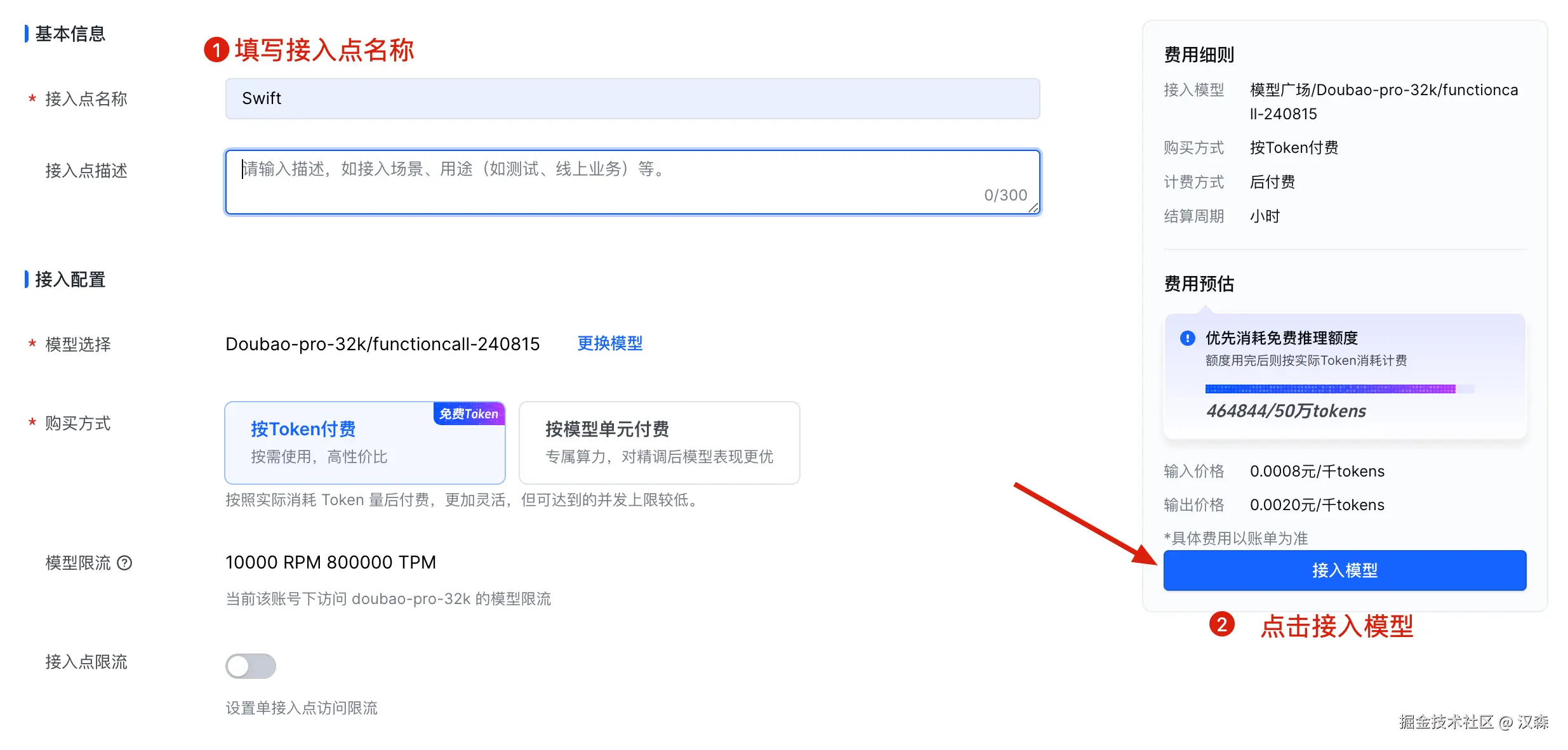 在上一步点击推理后,我们就进入了创建在线推理的页面,填写接入点名称,选择购买方式是“按 Token 付费”(有50万免费的tokens额度),最后点击接入模型。