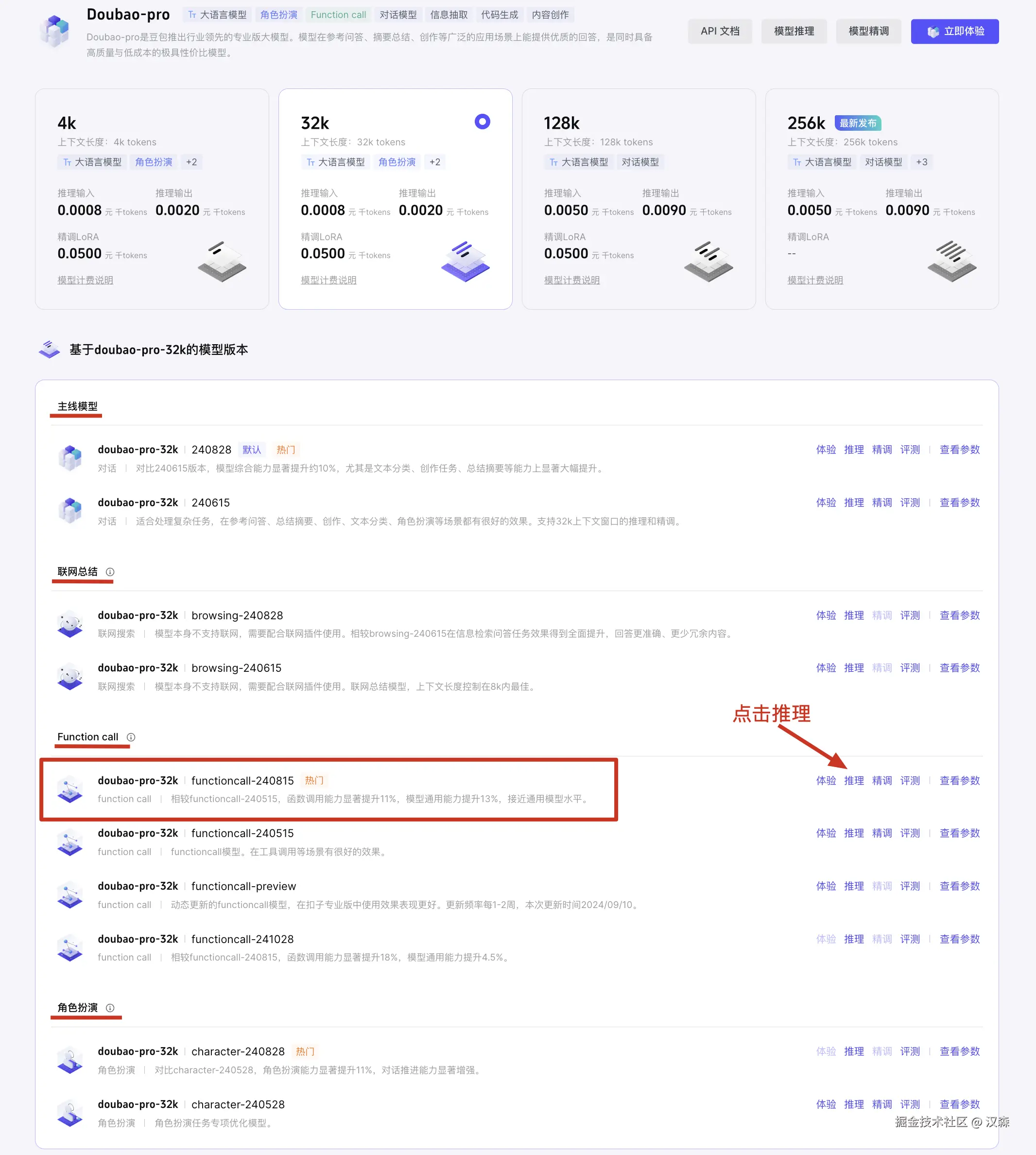 点击“模型详情”后,我们还要选择对应的模型版本,这里我们选择带 Function call 的模型(为什么选择这个版本,我们后面会说到)