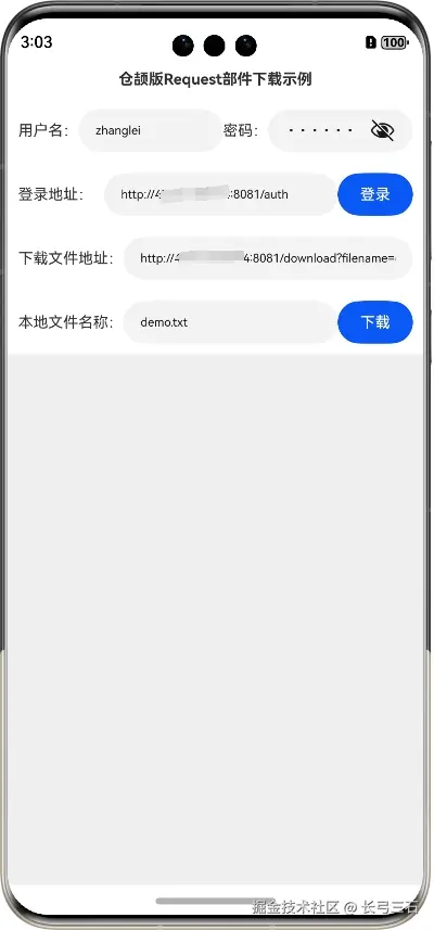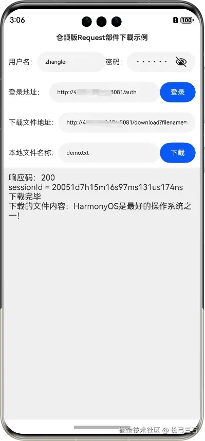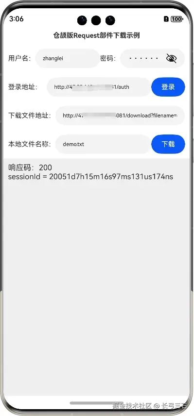 鸿蒙系统提供了上传下载部件,即Request部件,封装了上传下载能力,方便了相关功能的开发。不过,在当前适配仓颉语言的Request部件中,只提供了基于代理(Agent)的上传下载能力,方便性也相对ArkTS语言差一些,毕竟是刚开始适配,以后应该会提供更丰富的功能。本文将使用仓颉语言基于Request部件实现文件下载功能,下载文件的服务端也是本系列第12篇文章《鸿蒙网络编程系列12-使用Request部件下载文件到本地示例》中使用的服务端,该服务端需要登录后才可以下载,本文也复用了本系列第41篇文章《鸿蒙网络编程系列41-仓颉版HttpRequest模拟登录示例》中演示的模拟登录能力,在获取登录后的cookie后,把该cookie做为Request部件首部的一部分,做为服务端允许下载的凭据。