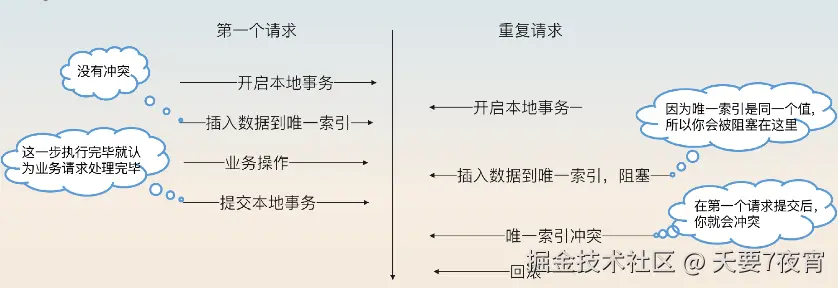 - 执行业务操作,操作完成后,将唯一索引更新为成功状态。