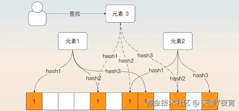 在进行查找的时候,也非常简单,我们只需要查询元素对应的比特位是不是 1,就可以粗略地判断这个元素是否在集合中存在。