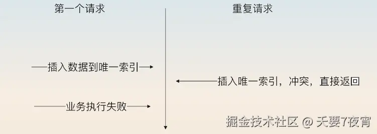 在这个方案里面,当第一次处理请求的时候,将数据插入到唯一索引成功了,后面的业务处理失败了怎么解决?