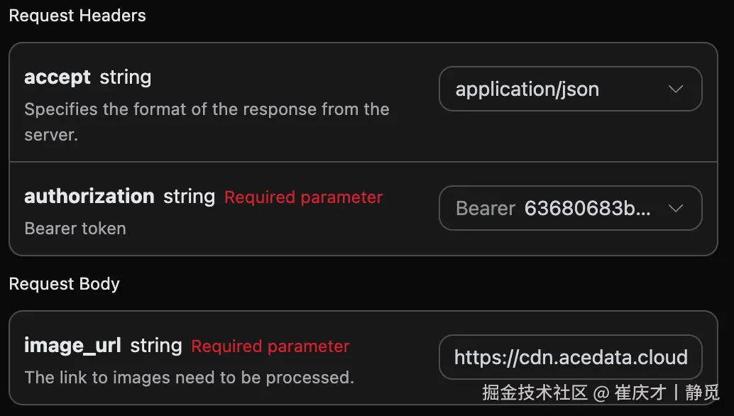 accept:想要接收怎样格式的响应结果,这里填写为application/json,即 JSON 格式。authorization:调用 API 的密钥,申请之后可以直接下拉选择。