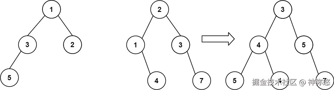 想象一下,当你将其中一棵覆盖到另一棵之上时,两棵树上的一些节点将会重叠(而另一些不会)。你需要将这两棵树合并成一棵新二叉树。合并的规则是:如果两个节点重叠,那么将这两个节点的值相加作为合并后节点的新值;否则,不为 null 的节点将直接作为新二叉树的节点。
