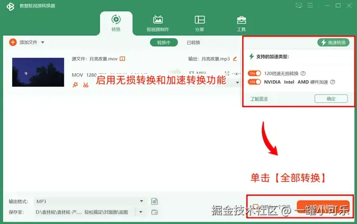 ▸步骤3:返回视频格式转换界面,点击【高速转换】按钮,启用无损转换和加速转换功能,最后单击【全部转换】即可。