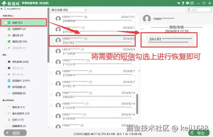 步骤2:等待扫描完成之后,点击左侧 【信息】 目录查看可恢复的短信内容。勾选需要的短信进行恢复并导出保存即可。