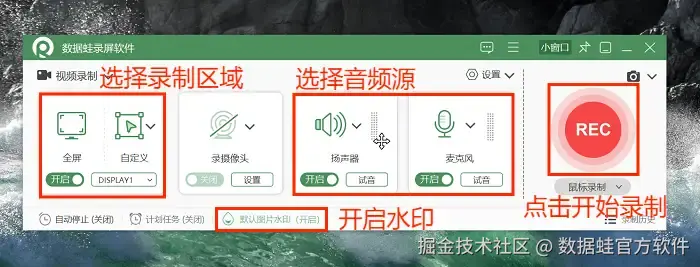 步骤2: 进入选择的录制模式后,我们可以先调整录制的区域和音频源,如果有需要,还可以点击打开水印录制,自由设置水印图片。全部设置好后,就可以点击 “REC” 开始录屏了。
